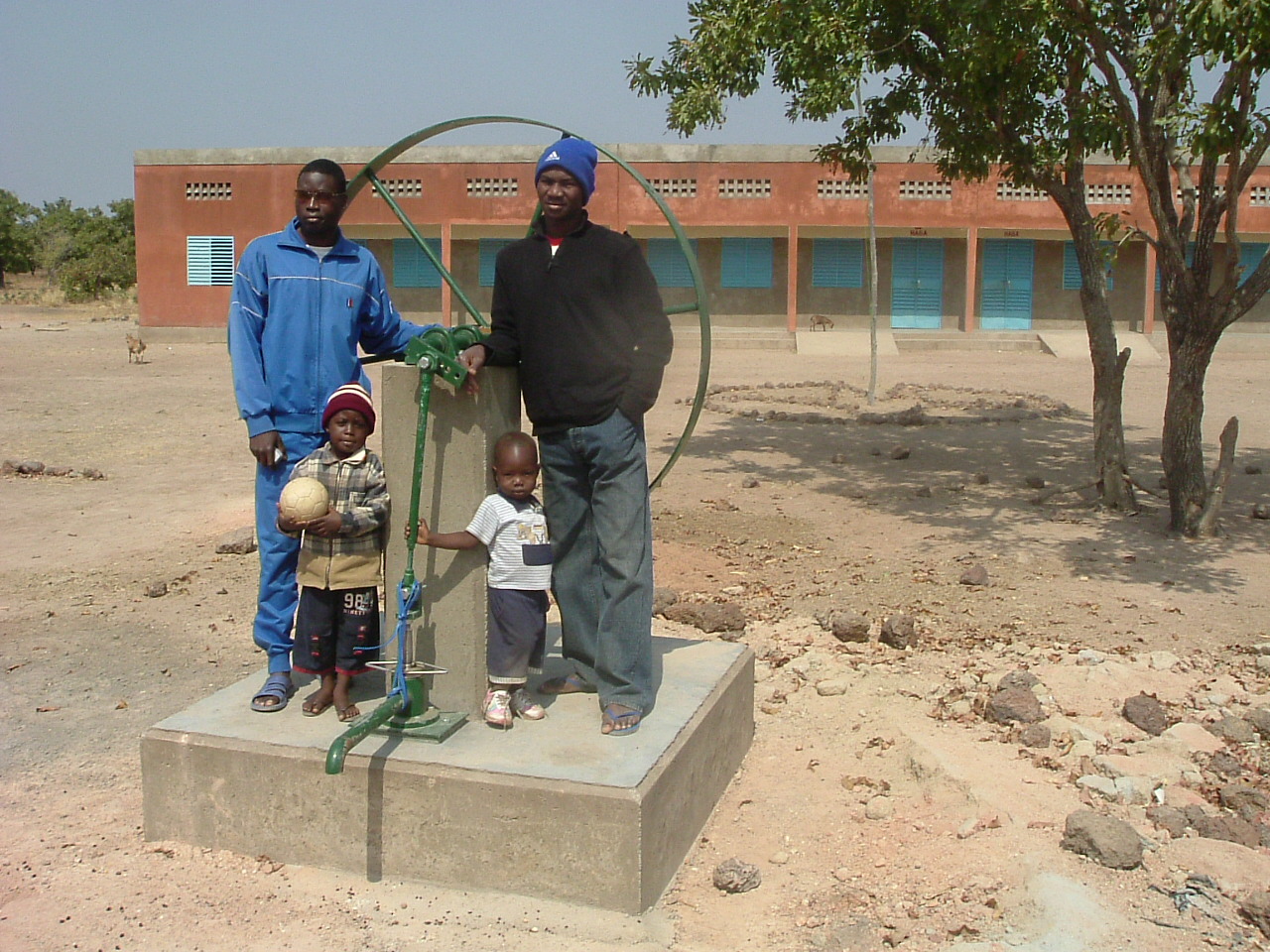Directeur de l'école et son adjoint posant devant la pompe à volant, devant l'école. Le matériel vient d'être posé sur la dalle; le muret de protection n'était pas encore construit. (©photo: Solidarité Santé Burkina)