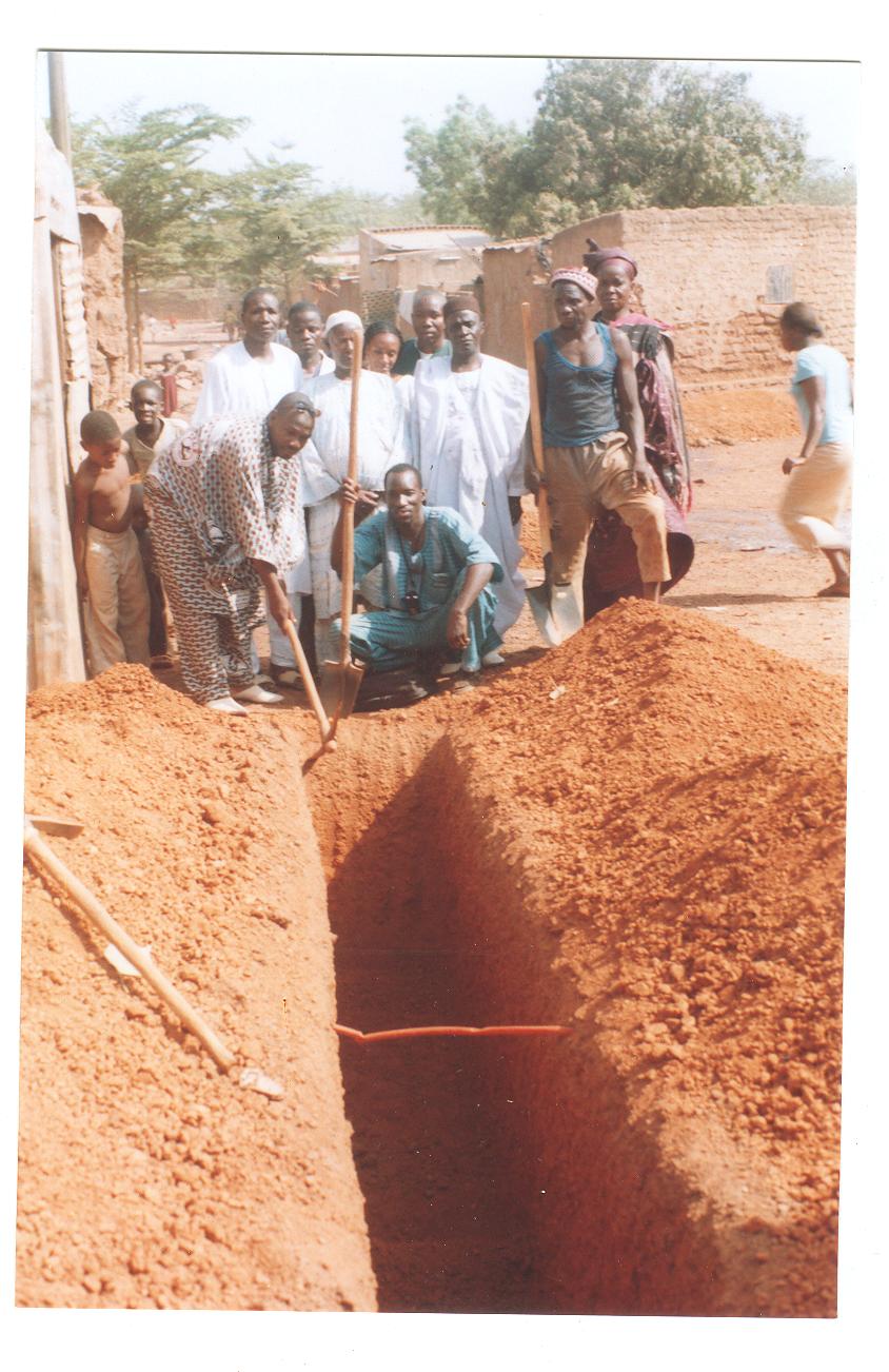 Terrassiers et notables posant devant la fouille de la tranchée pour l'adduction d'eau