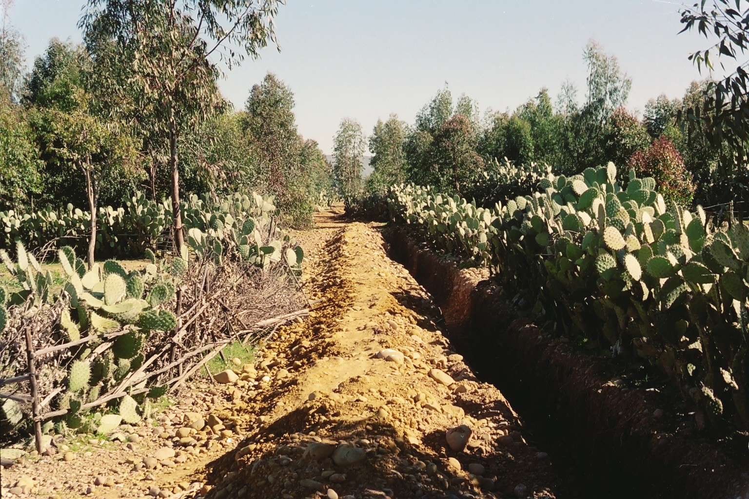 Tranchées réalisées pour le raccordement du nouveau réseau à la canalisation de l'Onep.(©photo Areed) Tranchées réalisées pour le raccordement du nouveau réseau à la canalisation de l'Onep - ici, dans un chemin bordé de cactus, protégeant des jardins potagers.(©photo Areed)