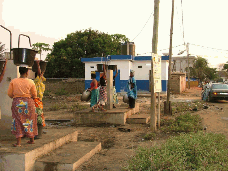 Affluence aux bornes-fontaines; comme la population est importante dans ce quartier, 4 bornes ont été installées au lieu des 2 initiales. Au fond, vue sur le bloc sanitaire.(©photo: ASDVT)