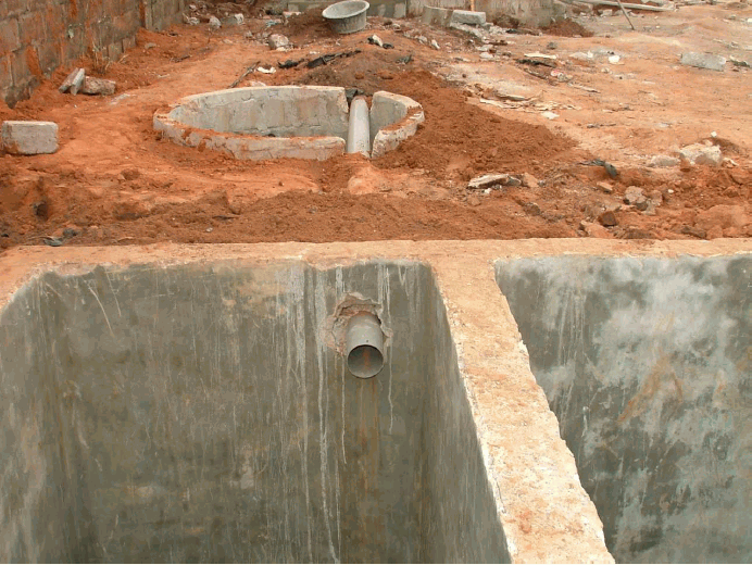 Détail des conduites d'écoulement vers les citernes sur le chantier de construction du bloc sanitaire - Nukafu.