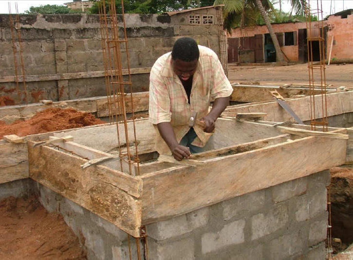 Un maçon assemble le coffrage d'un chaînage en béton armé, pour le bloc sanitaire.(©photo: ASDVT)