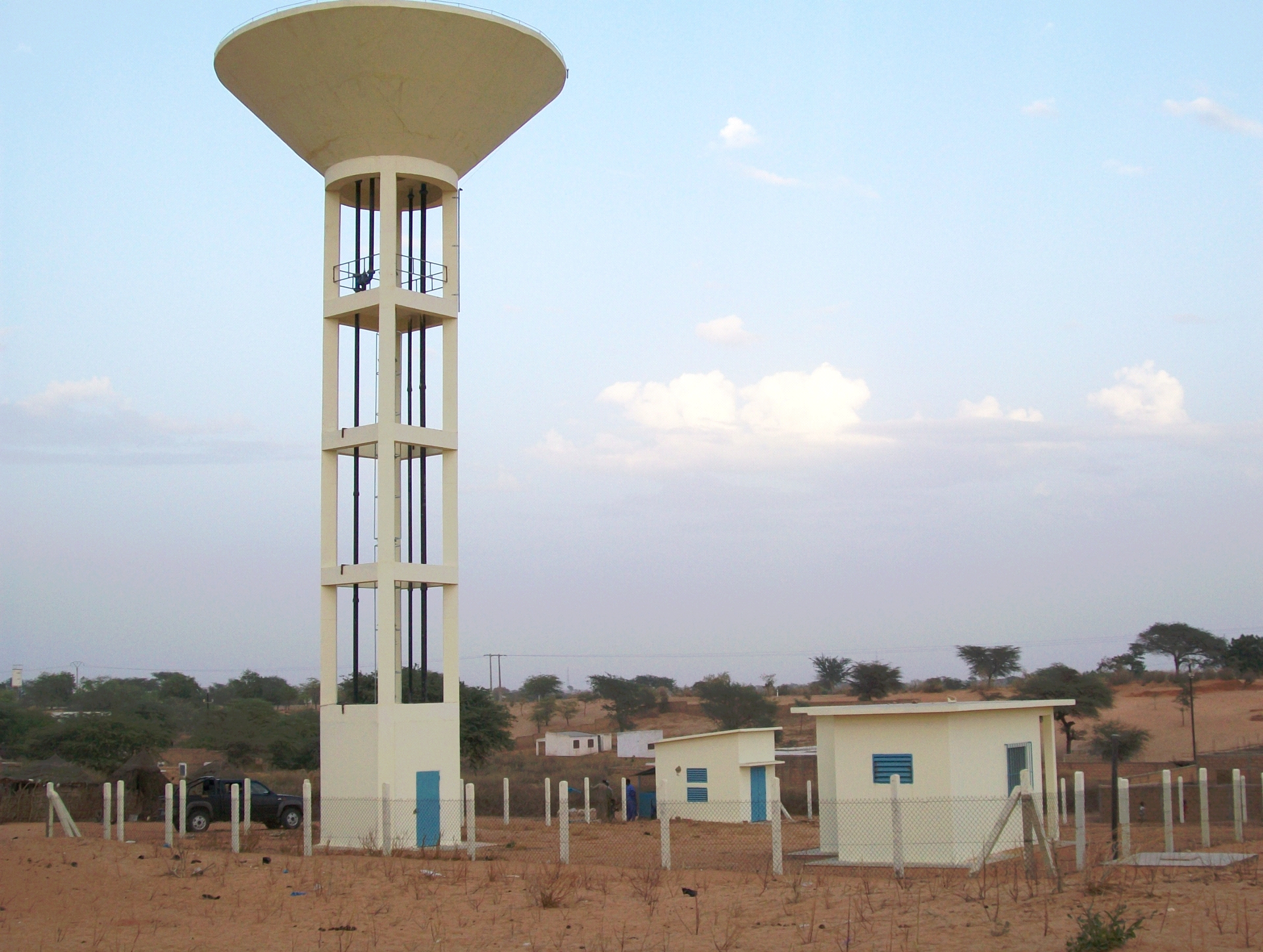 Château d'eau de Ndiobène Batar (100m/20m) avec cabine de pompage et ouvrages annexes (abri, clôture, logement du conducteur..) (©photo: Jumelage Malemort-Sakal)