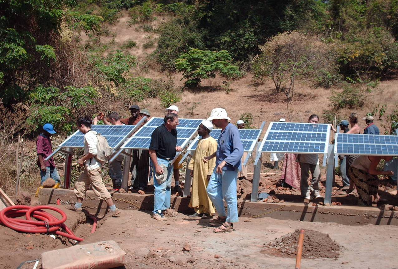 Equipe d'installateurs devant l'ensemble des panneaux solaires générant l'électricité pour le pompage de l'eau (© photo : Saga/Hsf)