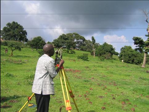 Relevé topographique du terrain à l'aide d'un niveau-théodolite par un membre de l'équipe de la maîtrise d'oeuvre (© photo : Saga/Hsf)