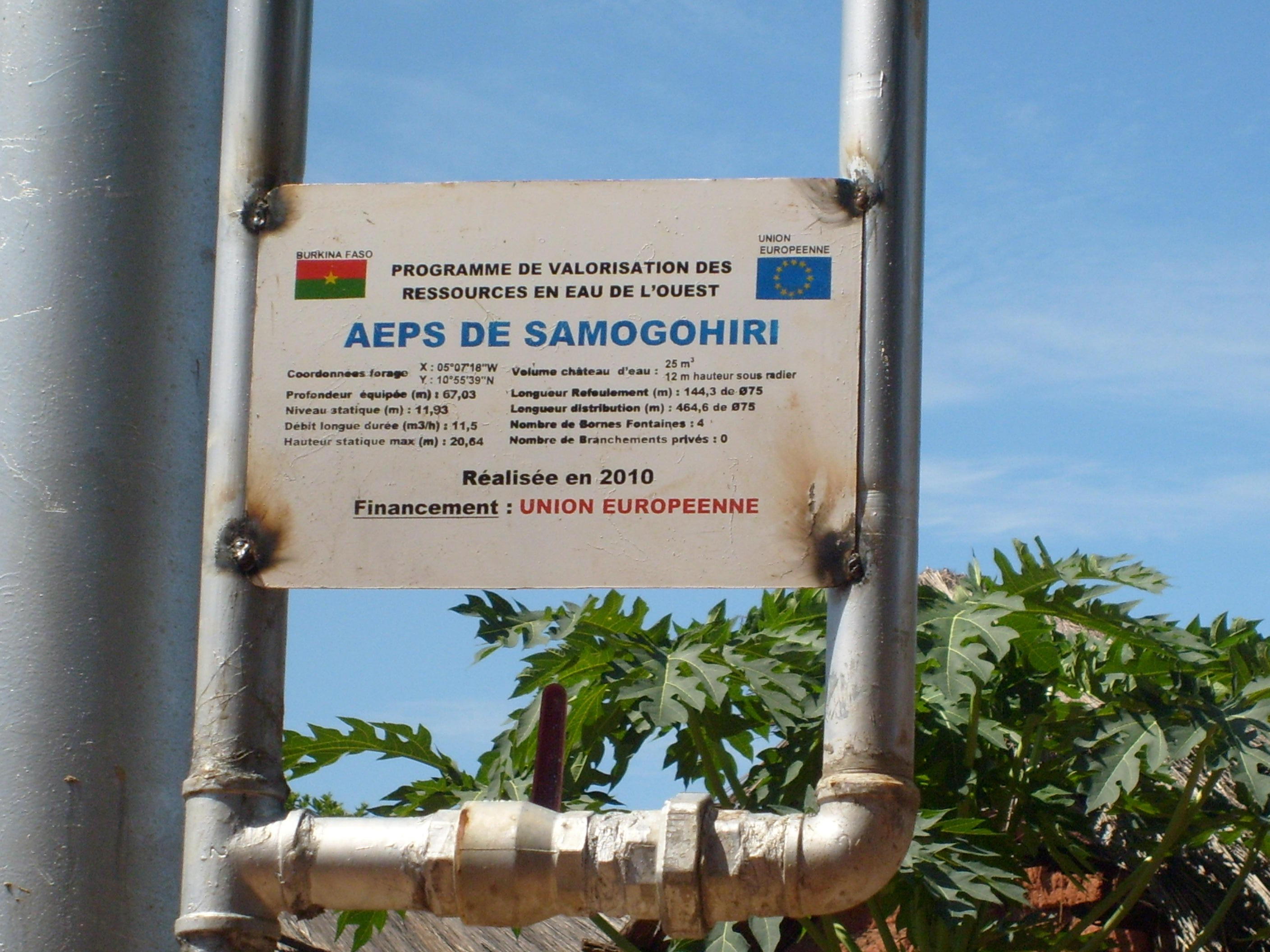 Plaque signalétique d'identification de VREO (Valorisation des Ressources en Eaux de l'Ouest) sur le pilier du nouveau château d'eau de Samogohiri (© JF Guyonneau)