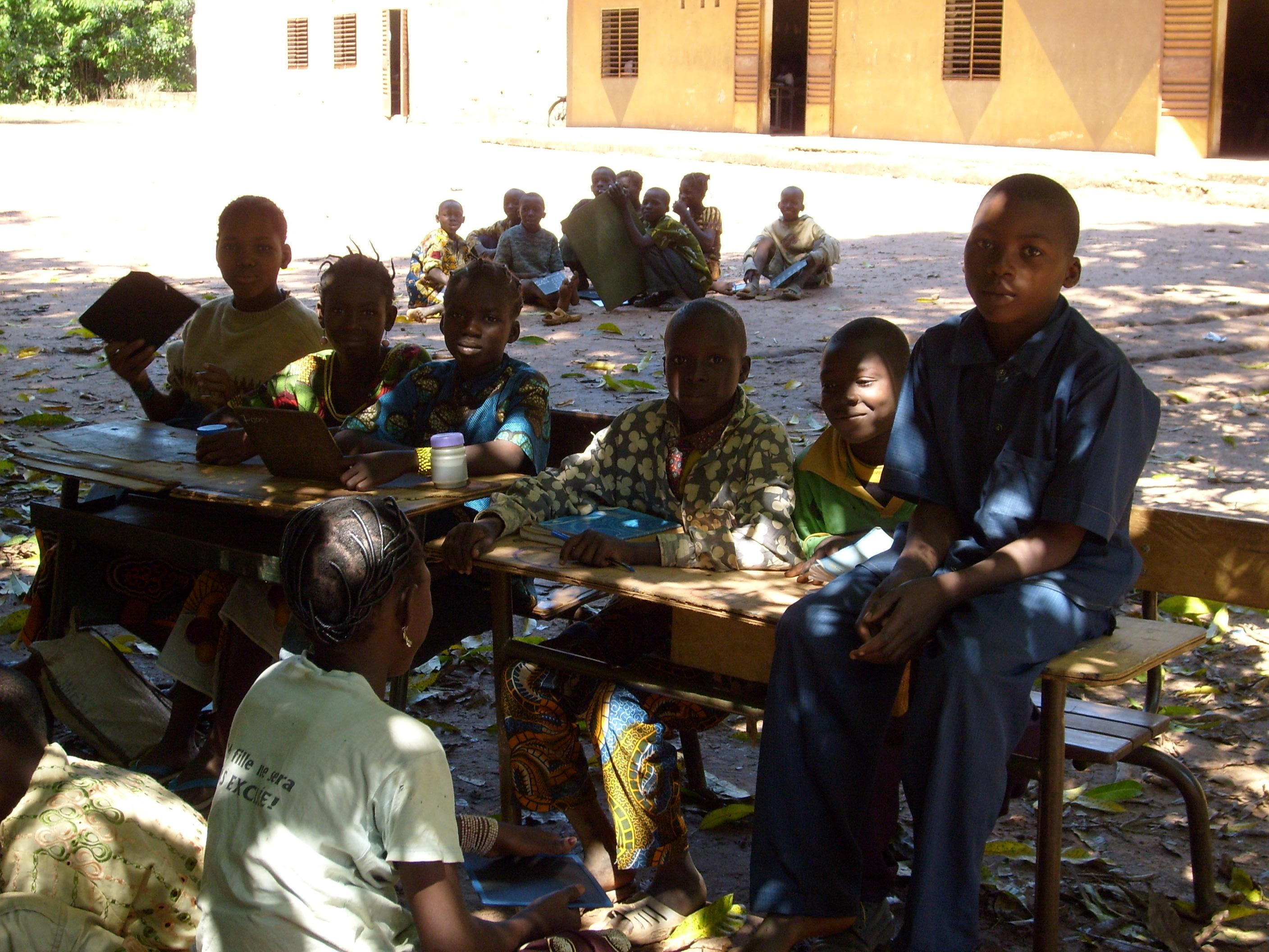 Les enfants de l'école primaire A en discussion pendant la construction de la fontaine de leur Ecole (© JF Guyonneau)