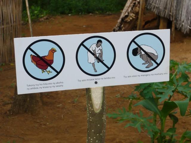 Petit panneau d'information posé sur la borne-fontaine, rappelant les 3 règles d'hygiène à respecter aux abords de la fontaine: pas d'animaux, ne pas se lever, ne pas faire ses besoins (©photo: SEM)