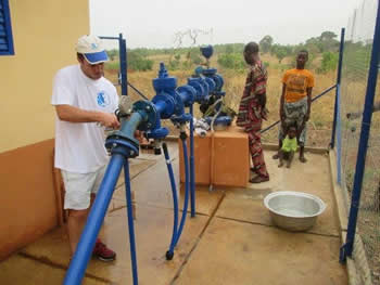 Une mission de contrôle effectuée en mars 2015 confirme un excellent état du réseau et des installations techniques (aucune fuite constatée) et une gestion rigoureuse et saine, même si le volume vendu n'est pas encore à la hauteur des estimations initiales. Affaire à suivre. Répartition budgétaire du partenariat A partir des éléments techniques et du cadre partenarial clairement établi, la mobilisation de plusieurs acteurs publics et privés a permis de boucler le budget estimé à environ 242 500 €, répartis ainsi : • Collectivités locales partenaires - commune rurale de Boukombé 25 300 € - populations bénéficiaires du projet 6 000 € • Partenaires en France - Aquassistance 35 200 € - AEREB 9 000 € - Eurocopter 5 000 € - SAS Pellet 1 000 € - Siaep de Barjac : 16 000 € - Agence de l'eau, Rhône, Méditerranée et Corse 121 500 € - Région Languedoc Roussillon 9 000 € - Conseil général du Gard 14 500 € |