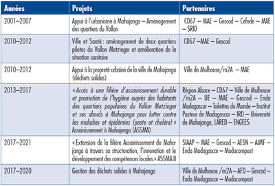Entre 2008 et 2012, le projet « Appui à la propreté urbaine de la Ville de Mahajanga » en partenariat avec la Ville de Mulhouse a permis de renforcer les compétences de la CUM pour la collecte des déchets. En 2010, un plan stratégique d'assainissement communal a été défini, déterminant un zonage de cinq secteurs urbains, le plus peuplé et le plus sensible étant le secteur du Vallon et ses abords.