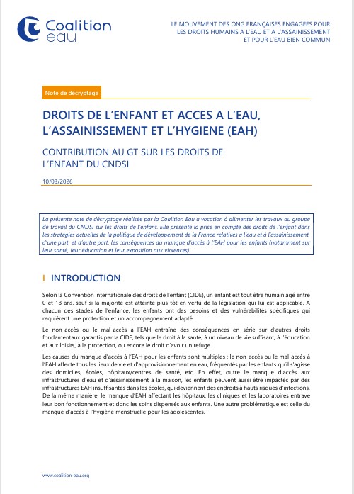 Nouvel acteur sur la scène française de l'eau, la Coalition Eau est un groupement d'ONG mobilisées en France et à l'international pour concrétiser l'accès à l'eau et l'assainissement pour tous. Elle a pour objectifs de mieux faire entendre la voix du secteur associatif et de la société civile dans les débats institutionnels et publics et de constituer un espace de travail collectif et d'échanges renforcés entre associations françaises actives sur le secteur de l'accès à l'eau et l'assainissement.