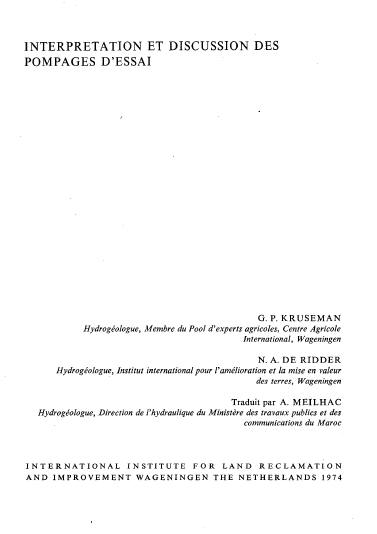 (Analysis and Evaluation of Pumping Test Data; ILRI) Traduction du Bulletin 11 : Analysis and Evaluation of Pumping Test Data; ILRI Wageningen, 1973, 2nd edition. rapport Aut. N.A. de Ridder & G.P. Kruseman & A. Meilhac ; 228 pages | Jan 1973