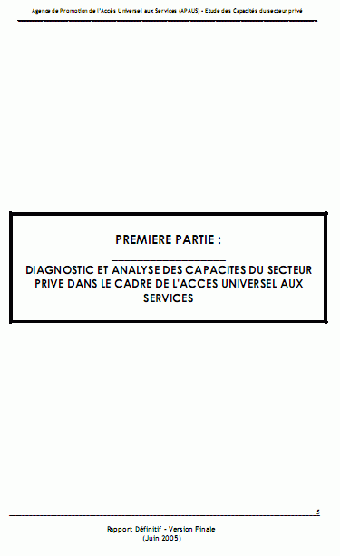 Objectifs: Le gouvernement de la République Islamique de Mauritanie a créé l'Agence d'Accès Universel aux Services en vue de mettre en oeuvre une politique progressive de généralisation des services essentiels au développement économique et au bien-être social, notamment les services d'eau, d'électricité et de télécommunications-NTIC. En cohérence avec la politique du gouvernement orientée vers la promotion du secteur privé, elle complète et enrichit, à travers la recherche de partenariats public-privé, les mécanismes de marché.