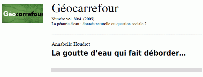 Activités: Fondée en 1927, Géocarrefour (anciennement Etudes Rhodaniennes puis Revue de Géographie de Lyon) est une des plus anciennes revues de géographie d'expression française. Elle est publiée quatre fois par an par l'Association des amis de la Revue de Géographie de Lyon. Géocarrefour publie des numéros thématiques, dont les sujets sont arrêtés par le comité de rédaction sur proposition du ou des éditeurs scientifiques.