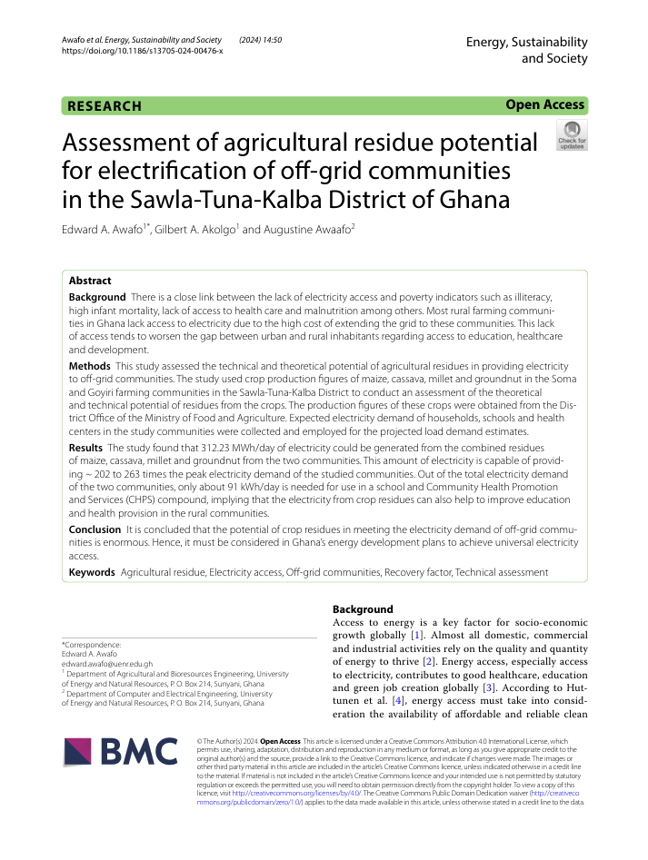 Assessment of agricultural residue potential for electrification of off-grid communities in the Sawla-Tuna-Kalba District of Ghana