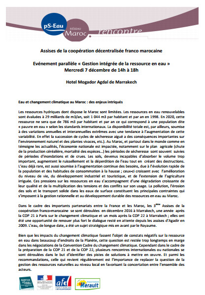 Assises de la coopération décentralisée franco marocaine - Evénement parallèle « Gestion intégrée de la ressource en eau » Mercredi 7 décembre 2016 rapport ; 10 pages | Mar 2017
