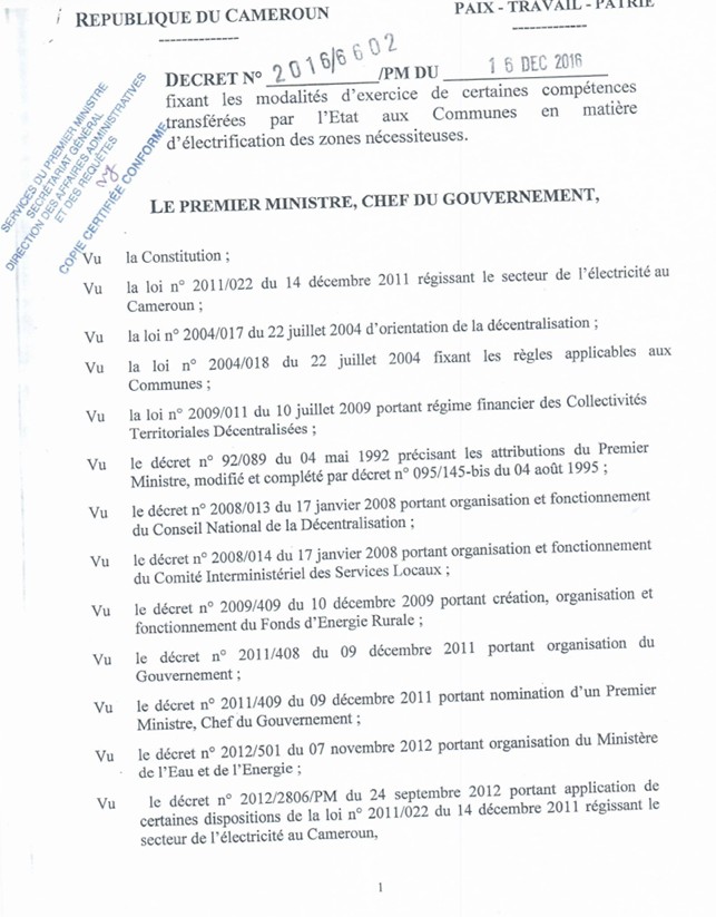 Décret N° 2016/6602/PM du 16 Décembre 2016 fixant les modalités d'exercice de certaines compétences transférées par l'Etat aux communes en matière d'électrification des zones nécessiteuses