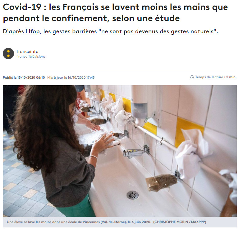 D'après l'Ifop, les gestes barrières "ne sont pas devenus des gestes naturels". article de presse ; 3 pages | Oct 2020