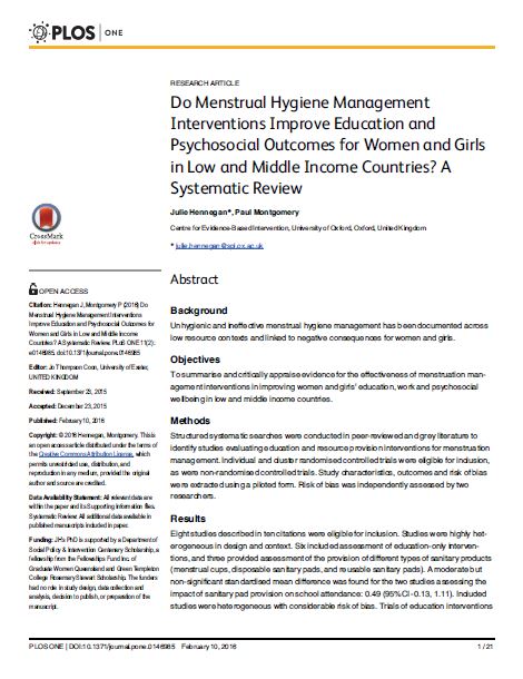 (Mesure dans l'étude de la santé et de l'hygiène menstruelles : Un examen et un audit systématiques) article Aut. Julie Hennegan ; 32 pages | Jun 2020