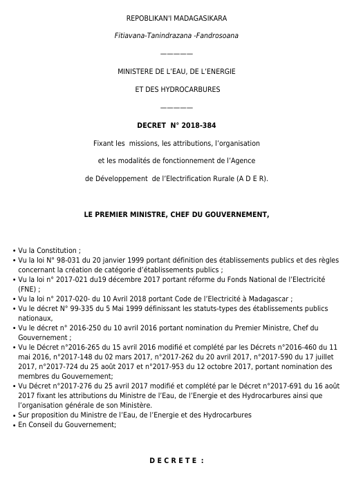Décret n°2018-384 Fixant les missions, les attributions, l'organisation et les modalités de fonctionnement de l'Agence de Développement de l'Electrification Rurale (ADER)