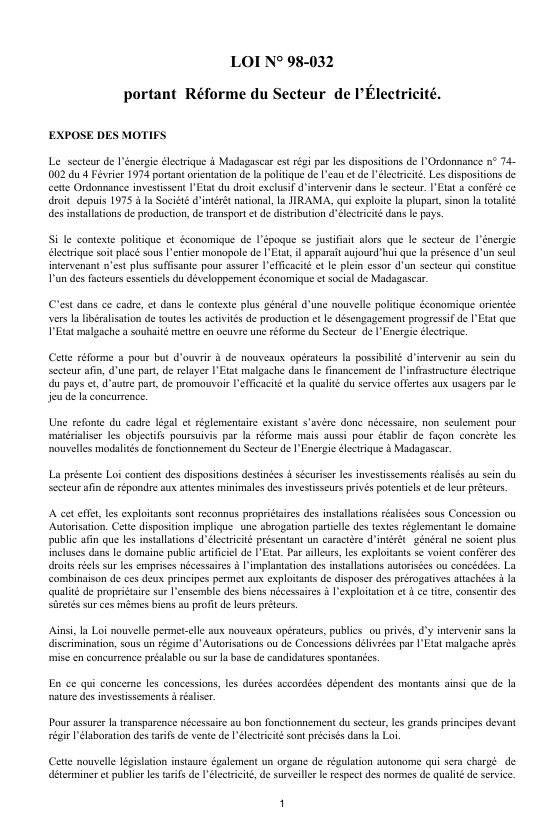 Loi 98-032 du 20 janvier 1999 : Portant Réforme du Secteur de l'Électricité