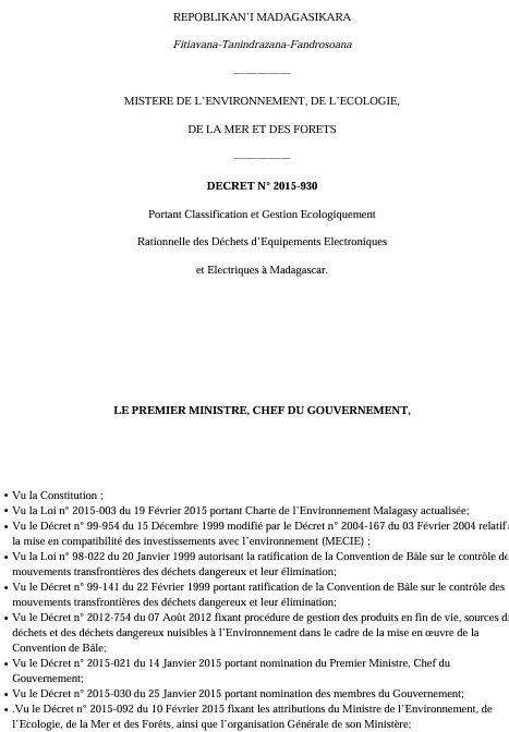 Décret n° 2015-930 Portant Classification et Gestion Ecologiquement Rationnelle des Déchets d'Equipements Electroniques et Electriques à Madagascar