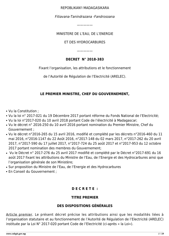 Décret n°2018-383 du 24 Avril 2018 Fixant l'organisation, les attributions et le fonctionnement de l'Autorité de Régulation de l'Electricité (ARELEC)