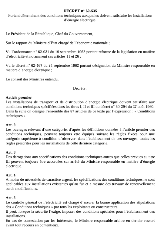 Décret n° 62-535 Portant déterminant des conditions techniques auxquelles doivent satisfaire les installations d'énergie électrique.