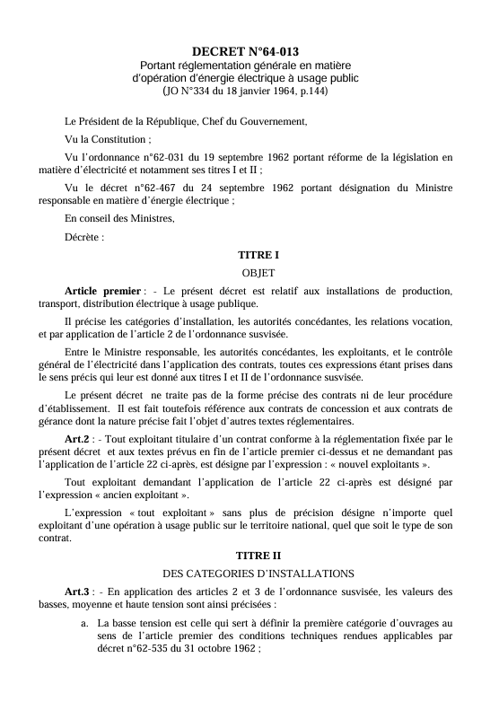 Décret n°64-013 Portant réglementation générale en matière d'opération d'énergie électrique à usage public