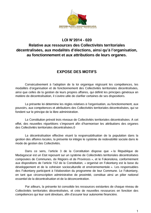 Loi n°2014-020 - Relative aux ressources des Collectivités territoriales décentralisées, aux modalités d'élections, ainsi qu'à l'organisation, au fonctionnement et aux attributions de leurs organes.