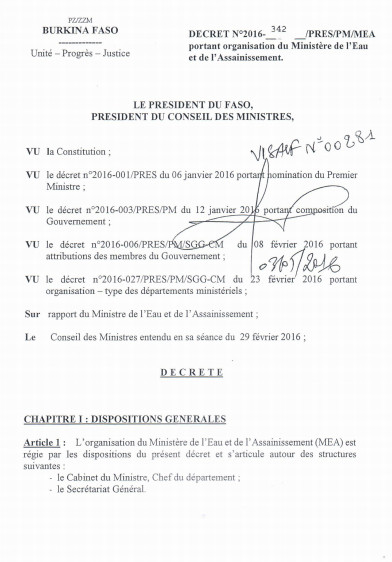 Décret portant organisation du Ministère de l'eau et de l'assainissement au Burkina Faso